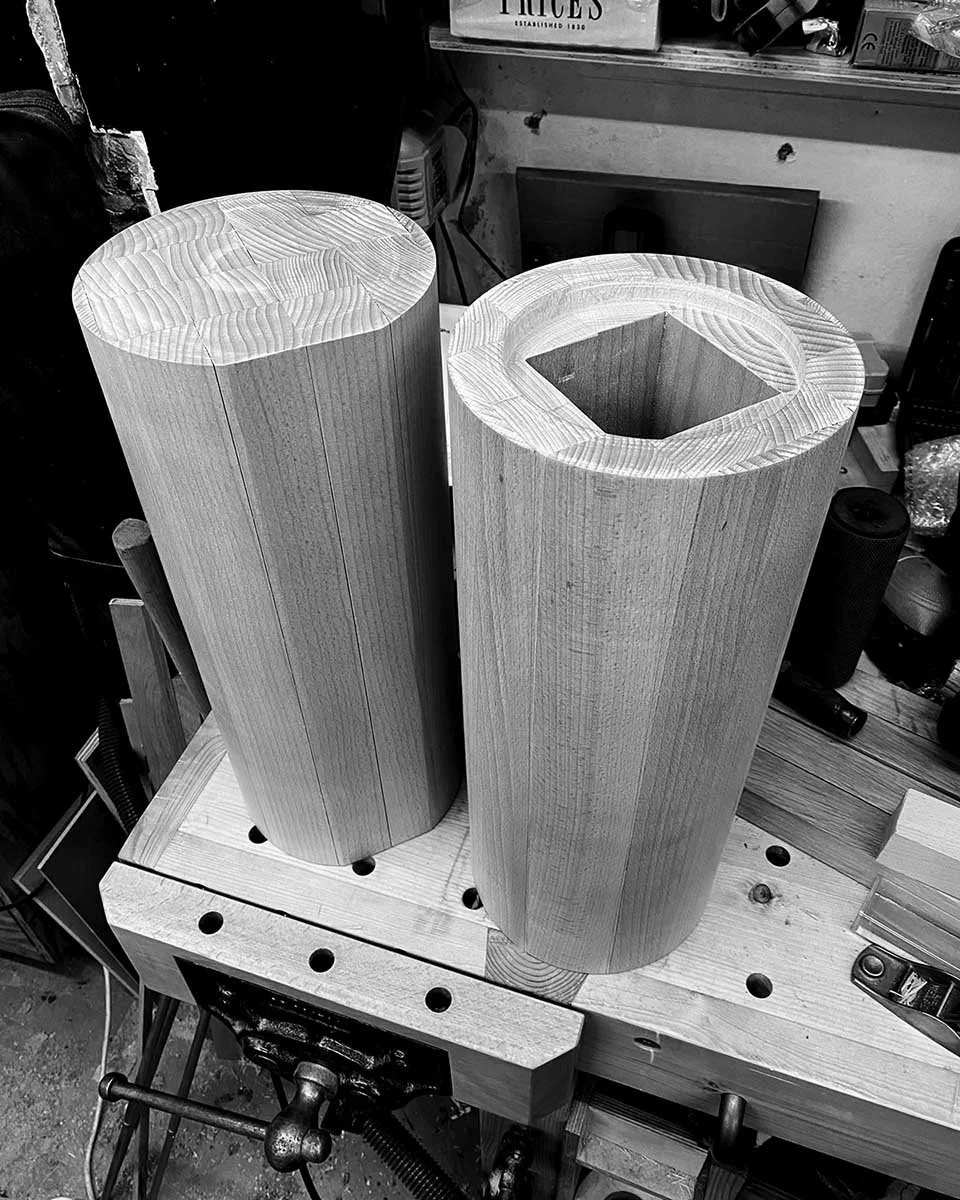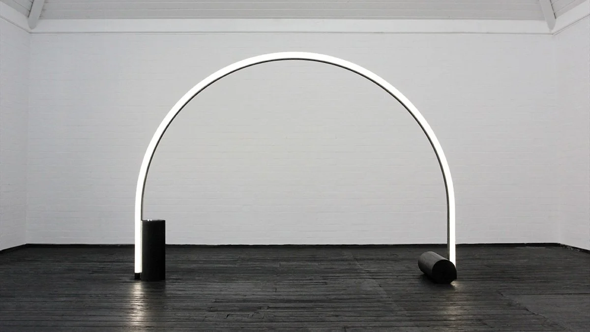 the portico floor light is made from 600 individual led's sat within a full 360° diffuser, meaning it can be enjoyed from all angles. lead by modernist principles of using materials for a machine age, the structure takes advantage of a tubular arc structure made from three sections of 304 stainless steel. the pillar-like weights at the base are made from stained english beech felled from a row of trees under threat of beech dieback in oxfordshire.