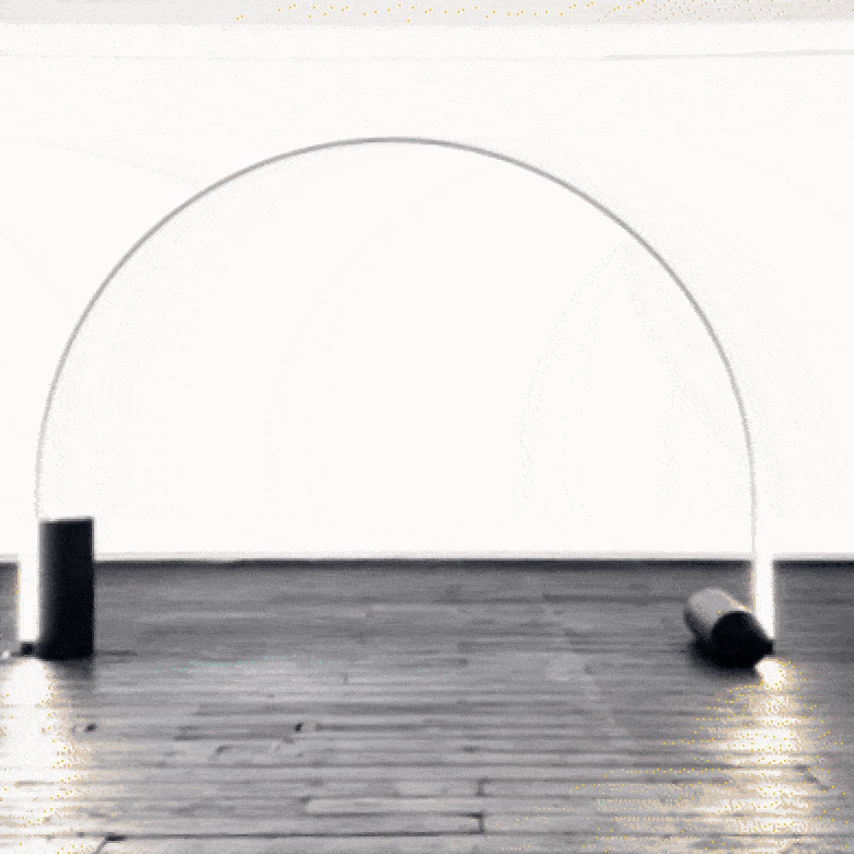 the two pillar weights at the base are made from english beech and were hand turned on a lathe before being finished in satin black stain. the vertical standing pillar houses the power supply and dimmer switch, allowing the user to control the on/off modes as well as the brightness of the lamp. the horizontal pillar weight provides additional balance to the piece. the 304 stainless steel tube has been formed through a hydraulic ring roller to achieve the large 5 metre long support, it was then cut into 3 sections that form the full arc when slotted together. the light diffuser feeds through a series of t-shaped screws that run along the steel arc, each component can be unscrewed from one another when transporting it or for compact storage.